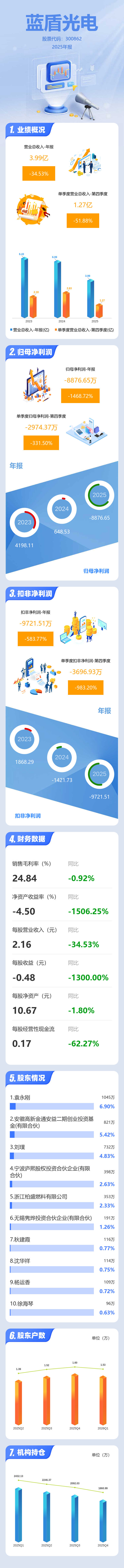 证券之星消息,蓝盾光电2025年年报显示,当年度公司主营收入3.99亿元,同比下降34.53%;归母净利润-8876.65万元,同比下降1468.72%;扣非净利润-9721.51万元,同比下降583.78%;其中2025年第四季度,公司单季度主营收入1.27亿元,同比下降51.88%;单季度归母净利润-2974.37万元,同比下降331.5%;单季度扣非净利润-3696.93万元,同比下降983.21%;负债率17.67%,投资收益-1188.97万元,财务费用-834.91万元,毛利率24.84%。