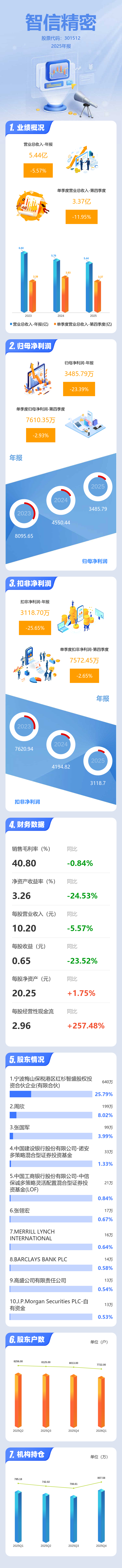 证券之星消息,智信精密2025年年报显示,当年度公司主营收入5.44亿元,同比下降5.57%;归母净利润3485.79万元,同比下降23.4%;扣非净利润3118.7万元,同比下降25.65%;其中2025年第四季度,公司单季度主营收入3.37亿元,同比下降11.95%;单季度归母净利润7610.35万元,同比下降2.93%;单季度扣非净利润7572.45万元,同比下降2.66%;负债率23.13%,财务费用-180.25万元,毛利率40.8%。