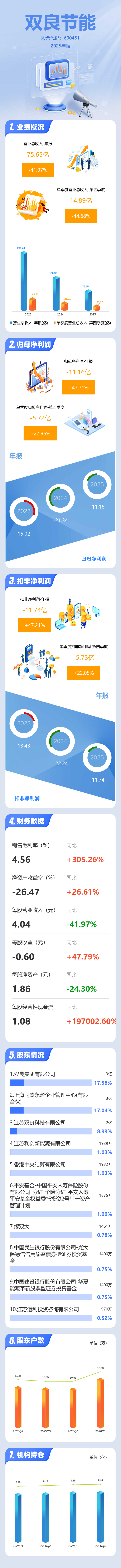 证券之星消息,双良节能2025年年报显示,当年度公司主营收入75.65亿元,同比下降41.98%;归母净利润-11.16亿元,同比上升47.71%;扣非净利润-11.74亿元,同比上升47.21%;其中2025年第四季度,公司单季度主营收入14.89亿元,同比下降44.69%;单季度归母净利润-5.72亿元,同比上升27.97%;单季度扣非净利润-5.73亿元,同比上升22.05%;负债率85.01%,投资收益-2342.17万元,财务费用3.86亿元,毛利率4.56%。