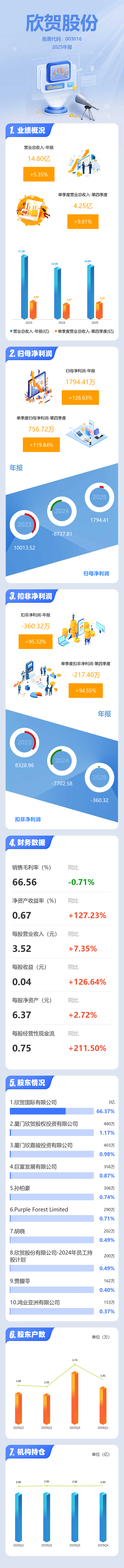证券之星消息,欣贺股份2025年年报显示,当年度公司主营收入14.8亿元,同比上升5.35%;归母净利润1794.41万元,同比上升126.63%;扣非净利润-360.32万元,同比上升95.32%;其中2025年第四季度,公司单季度主营收入4.25亿元,同比上升9.81%;单季度归母净利润756.72万元,同比上升119.85%;单季度扣非净利润-217.4万元,同比上升94.56%;负债率25.34%,投资收益1114.73万元,财务费用-1256.82万元,毛利率66.56%。