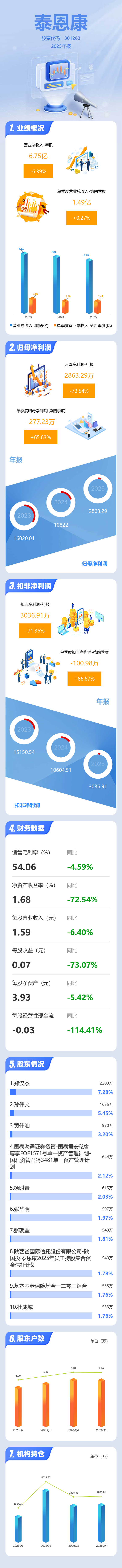 证券之星消息,泰恩康2025年年报显示,当年度公司主营收入6.75亿元,同比下降6.4%;归母净利润2863.29万元,同比下降73.54%;扣非净利润3036.91万元,同比下降71.36%;其中2025年第四季度,公司单季度主营收入1.49亿元,同比上升0.27%;单季度归母净利润-277.23万元,同比上升65.84%;单季度扣非净利润-100.98万元,同比上升86.68%;负债率27.97%,投资收益70.42万元,财务费用1010.42万元,毛利率54.06%。