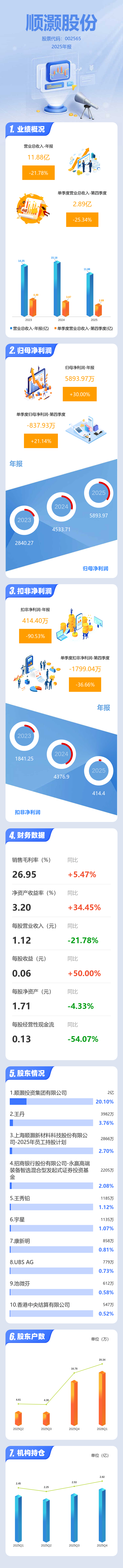证券之星消息,顺灏股份2025年年报显示,当年度公司主营收入11.88亿元,同比下降21.78%;归母净利润5893.97万元,同比上升30.0%;扣非净利润414.4万元,同比下降90.53%;其中2025年第四季度,公司单季度主营收入2.89亿元,同比下降25.34%;单季度归母净利润-837.93万元,同比上升21.14%;单季度扣非净利润-1799.04万元,同比下降36.66%;负债率23.64%,投资收益3151.25万元,财务费用-58.82万元,毛利率26.95%。