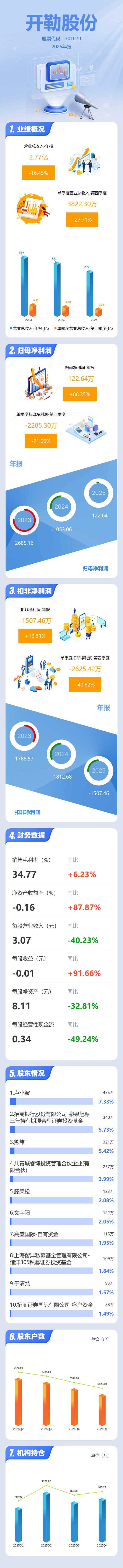证券之星消息,开勒股份2025年年报显示,当年度公司主营收入2.77亿元,同比下降16.46%;归母净利润-122.64万元,同比上升88.35%;扣非净利润-1507.46万元,同比上升16.84%;其中2025年第四季度,公司单季度主营收入3822.3万元,同比下降27.72%;单季度归母净利润-2285.3万元,同比下降21.07%;单季度扣非净利润-2625.42万元,同比下降40.83%;负债率16.91%,投资收益1359.64万元,财务费用41.92万元,毛利率34.77%。