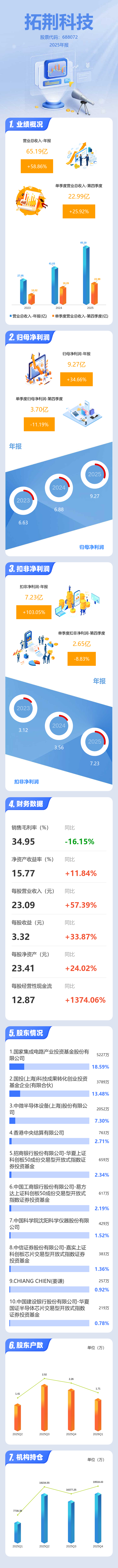 证券之星消息,拓荆科技2025年年报显示,当年度公司主营收入65.19亿元,同比上升58.87%;归母净利润9.27亿元,同比上升34.67%;扣非净利润7.23亿元,同比上升103.05%;其中2025年第四季度,公司单季度主营收入22.99亿元,同比上升25.93%;单季度归母净利润3.7亿元,同比下降11.2%;单季度扣非净利润2.65亿元,同比下降8.84%;负债率64.11%,投资收益4952.33万元,财务费用8520.27万元,毛利率34.95%。
