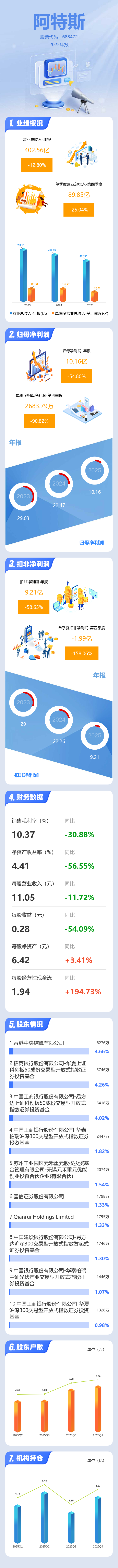 证券之星消息,阿特斯2025年年报显示,当年度公司主营收入402.56亿元,同比下降12.8%;归母净利润10.16亿元,同比下降54.8%;扣非净利润9.21亿元,同比下降58.65%;其中2025年第四季度,公司单季度主营收入89.85亿元,同比下降25.04%;单季度归母净利润2683.79万元,同比下降90.82%;单季度扣非净利润-1.99亿元,同比下降158.06%;负债率63.65%,投资收益-3032.02万元,财务费用5.5亿元,毛利率10.37%。