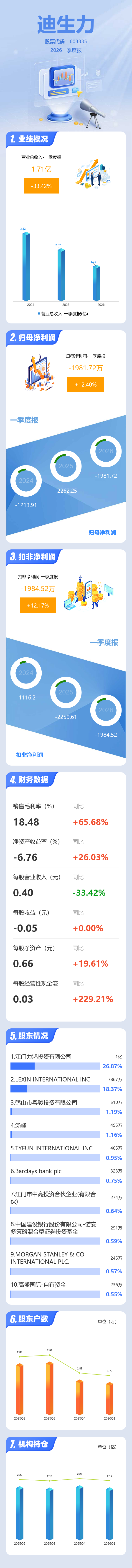 证券之星消息,迪生力2026年一季报显示,一季度公司主营收入1.71亿元,同比下降33.43%;归母净利润-1981.72万元,同比上升12.4%;扣非净利润-1984.52万元,同比上升12.17%;负债率64.65%,投资收益201.95万元,财务费用802.81万元,毛利率18.48%。
