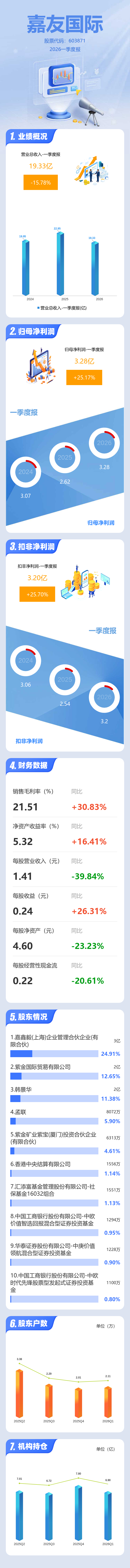 证券之星消息,嘉友国际2026年一季报显示,一季度公司主营收入19.33亿元,同比下降15.78%;归母净利润3.28亿元,同比上升25.18%;扣非净利润3.2亿元,同比上升25.71%;负债率28.37%,投资收益662.48万元,财务费用-1550.77万元,毛利率21.51%。
