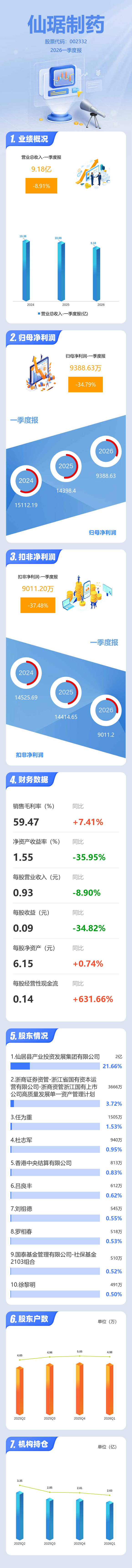 证券之星消息,仙琚制药2026年一季报显示,一季度公司主营收入9.18亿元,同比下降8.91%;归母净利润9388.63万元,同比下降34.79%;扣非净利润9011.2万元,同比下降37.49%;负债率15.73%,投资收益-557.19万元,财务费用371.0万元,毛利率59.47%。