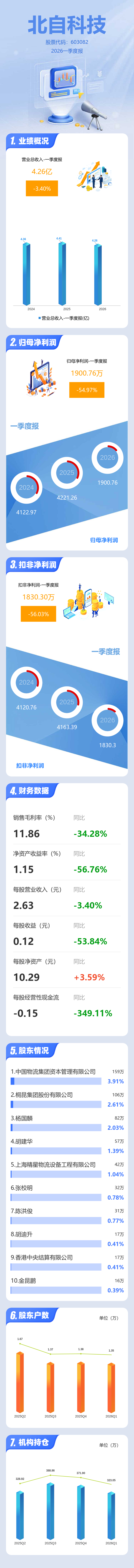证券之星消息,北自科技2026年一季报显示,一季度公司主营收入4.26亿元,同比下降3.41%;归母净利润1900.76万元,同比下降54.97%;扣非净利润1830.3万元,同比下降56.04%;负债率64.93%,财务费用-39.63万元,毛利率11.86%。