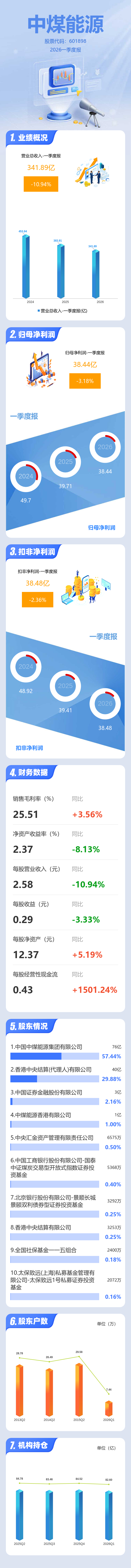 证券之星消息,中煤能源2026年一季报显示,一季度公司主营收入341.89亿元,同比下降10.95%;归母净利润38.44亿元,同比下降3.19%;扣非净利润38.48亿元,同比下降2.36%;负债率45.31%,投资收益6.39亿元,财务费用4.3亿元,毛利率25.51%。