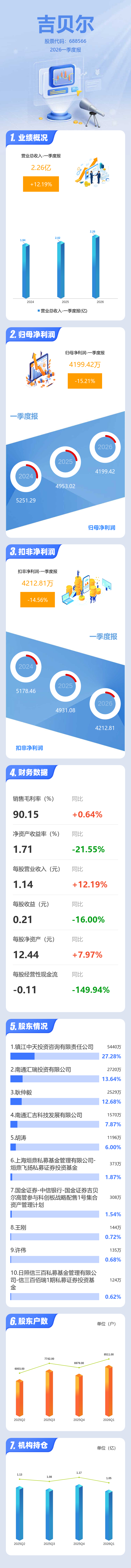 证券之星消息,吉贝尔2026年一季报显示,一季度公司主营收入2.26亿元,同比上升12.2%;归母净利润4199.42万元,同比下降15.21%;扣非净利润4212.81万元,同比下降14.57%;负债率8.18%,投资收益-137.28万元,财务费用-107.58万元,毛利率90.15%。