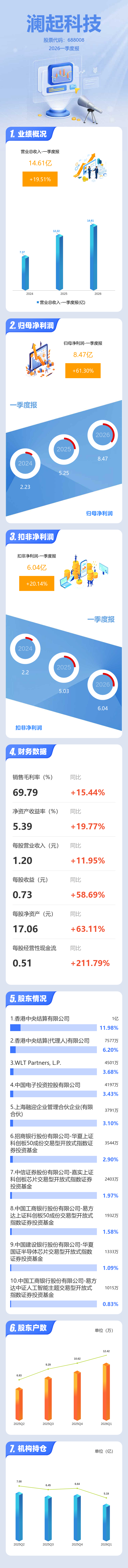 证券之星消息,澜起科技2026年一季报显示,一季度公司主营收入14.61亿元,同比上升19.51%;归母净利润8.47亿元,同比上升61.3%;扣非净利润6.04亿元,同比上升20.14%;负债率4.17%,投资收益1109.28万元,财务费用2496.63万元,毛利率69.79%。