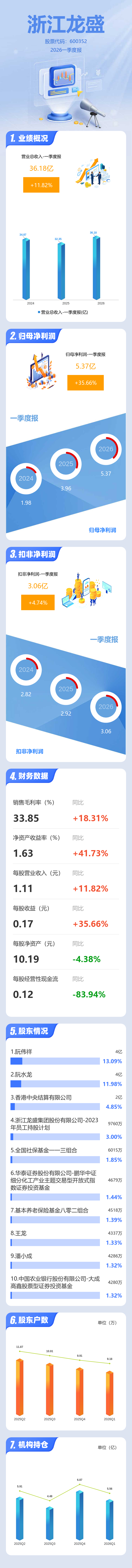 证券之星消息,浙江龙盛2026年一季报显示,一季度公司主营收入36.18亿元,同比上升11.83%;归母净利润5.37亿元,同比上升35.67%;扣非净利润3.06亿元,同比上升4.74%;负债率57.3%,投资收益4722.98万元,财务费用2.52亿元,毛利率33.85%。