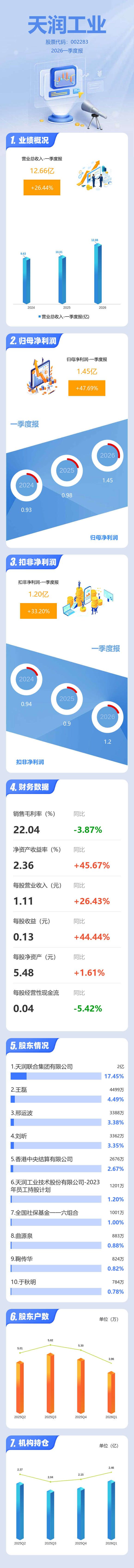 证券之星消息,天润工业2026年一季报显示,一季度公司主营收入12.66亿元,同比上升26.44%;归母净利润1.45亿元,同比上升47.7%;扣非净利润1.2亿元,同比上升33.2%;负债率26.14%,投资收益2430.33万元,财务费用515.38万元,毛利率22.04%。