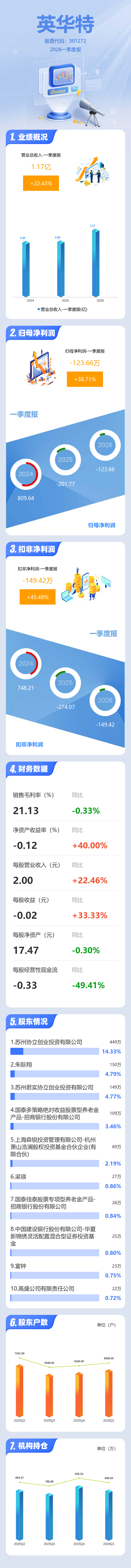 证券之星消息,英华特2026年一季报显示,一季度公司主营收入1.17亿元,同比上升22.43%;归母净利润-123.66万元,同比上升38.71%;扣非净利润-149.42万元,同比上升45.48%;负债率17.99%,投资收益20.53万元,财务费用106.16万元,毛利率21.13%。