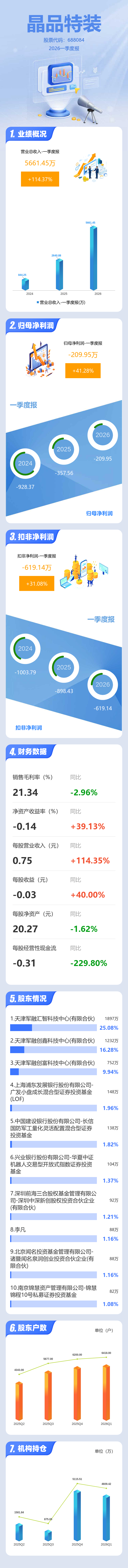 证券之星消息,晶品特装2026年一季报显示,一季度公司主营收入5661.45万元,同比上升114.38%;归母净利润-209.95万元,同比上升41.28%;扣非净利润-619.14万元,同比上升31.09%;负债率13.47%,投资收益403.8万元,财务费用-23.95万元,毛利率21.34%。