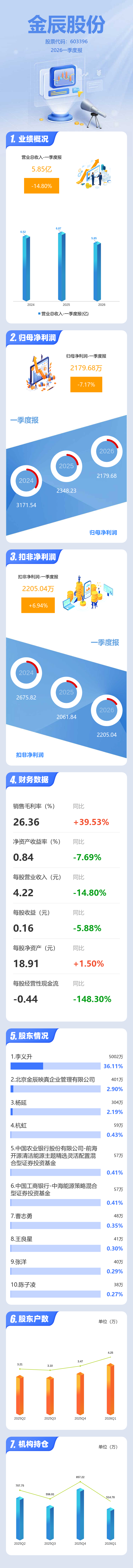 证券之星消息,金辰股份2026年一季报显示,一季度公司主营收入5.85亿元,同比下降14.8%;归母净利润2179.68万元,同比下降7.18%;扣非净利润2205.04万元,同比上升6.95%;负债率43.27%,投资收益-71.52万元,财务费用1767.05万元,毛利率26.36%。