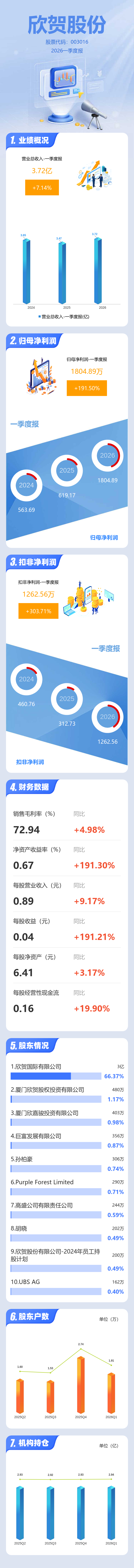 证券之星消息,欣贺股份2026年一季报显示,一季度公司主营收入3.72亿元,同比上升7.15%;归母净利润1804.89万元,同比上升191.5%;扣非净利润1262.56万元,同比上升303.72%;负债率23.52%,投资收益268.48万元,财务费用-260.53万元,毛利率72.94%。