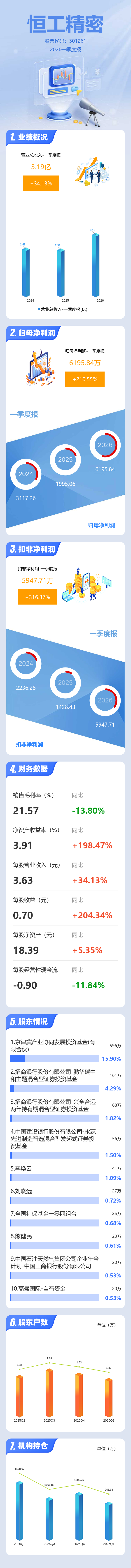 证券之星消息,恒工精密2026年一季报显示,一季度公司主营收入3.19亿元,同比上升34.14%;归母净利润6195.84万元,同比上升210.56%;扣非净利润5947.71万元,同比上升316.38%;负债率34.66%,投资收益5914.28万元,财务费用328.42万元,毛利率21.57%。
