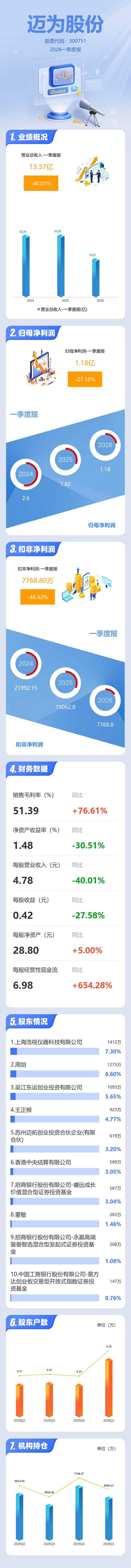 证券之星消息,迈为股份2026年一季报显示,一季度公司主营收入13.37亿元,同比下降40.02%;归母净利润1.18亿元,同比下降27.19%;扣非净利润7768.8万元,同比下降48.42%;负债率65.43%,投资收益621.65万元,财务费用5656.93万元,毛利率51.39%。