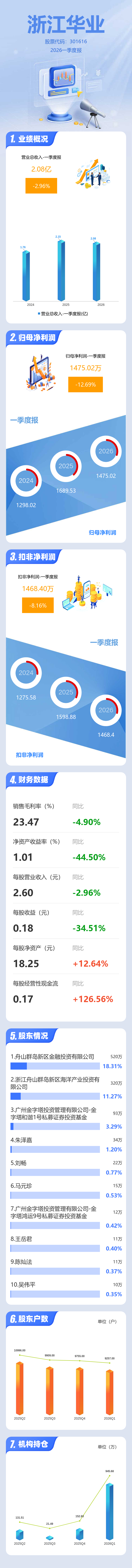 证券之星消息,浙江华业2026年一季报显示,一季度公司主营收入2.08亿元,同比下降2.96%;归母净利润1475.02万元,同比下降12.7%;扣非净利润1468.4万元,同比下降8.16%;负债率20.87%,投资收益12.26万元,财务费用69.12万元,毛利率23.47%。