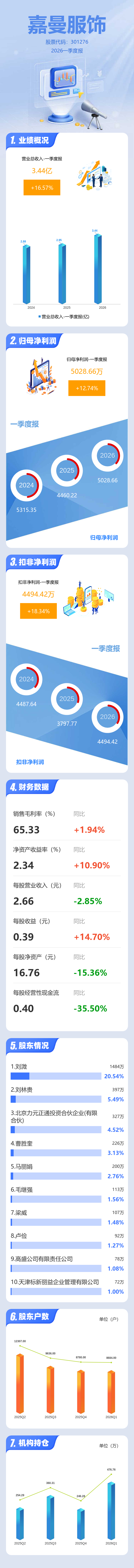 证券之星消息,嘉曼服饰2026年一季报显示,一季度公司主营收入3.44亿元,同比上升16.58%;归母净利润5028.66万元,同比上升12.74%;扣非净利润4494.42万元,同比上升18.34%;负债率17.04%,投资收益272.93万元,财务费用-17.11万元,毛利率65.33%。
