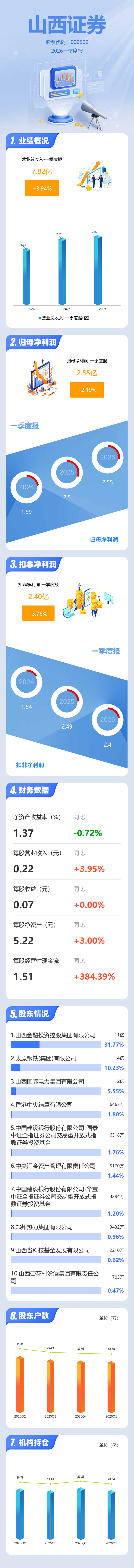 证券之星消息,山西证券2026年一季报显示,一季度公司主营收入7.82亿元,同比上升3.95%;归母净利润2.55亿元,同比上升2.2%;扣非净利润2.4亿元,同比下降3.76%;负债率79.08%,投资收益1.82亿元。