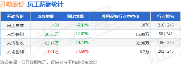 证券之星消息,4月28日开勒股份公布2025年年报,当年营收2.77亿元,同比减16.46%;净利润为-122.64万元,同比增88.35%。根据财报数据披露,当年公司员工总数438人,同比减6.41%;人均薪酬20.26万元,同比减12.07%;人均创收63.17万元,同比减10.74%;公司员工薪酬统计见下表: