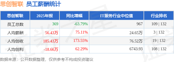 证券之星消息,4月28日思创智联公布2025年年报,当年营收6.84亿元,同比减0.94%;净利润为-6722.77万元,同比增86.59%。根据财报数据披露,当年公司员工总数369人,同比减63.79%;人均薪酬56.43万元,同比增75.11%;人均创收185.43万元,同比增173.55%;公司员工薪酬统计见下表: