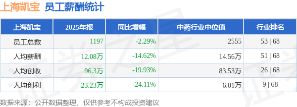 证券之星消息,4月28日上海凯宝公布2025年年报,当年营收11.53亿元,同比减21.76%;净利润为2.79亿元,同比减25.83%。根据财报数据披露,当年公司员工总数1197人,同比减2.29%;人均薪酬12.08万元,同比减14.62%;人均创收96.3万元,同比减19.93%;人均创利23.23万元,同比减24.11%;公司员工薪酬统计见下表: