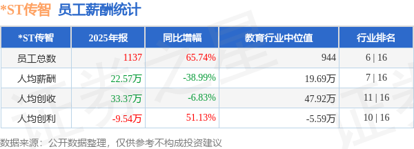 证券之星消息,4月28日*ST传智公布2025年年报,当年营收3.79亿元,同比增54.43%;净利润为-9044.85万元,同比增32.46%。根据财报数据披露,当年公司员工总数1137人,同比增65.74%;人均薪酬22.57万元,同比减38.99%;人均创收33.37万元,同比减6.83%;公司员工薪酬统计见下表: