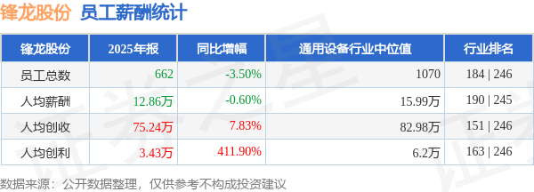 证券之星消息,4月28日锋龙股份公布2025年年报,当年营收4.98亿元,同比增4.06%;净利润为2268.85万元,同比增393.99%。根据财报数据披露,当年公司员工总数662人,同比减3.5%;人均薪酬12.86万元,同比减0.6%;人均创收75.24万元,同比增7.83%;人均创利3.43万元,同比增411.9%;公司员工薪酬统计见下表: