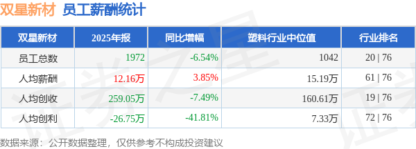 证券之星消息,4月28日双星新材公布2025年年报,当年营收51.08亿元,同比减13.54%;净利润为-5.27亿元,同比减32.53%。根据财报数据披露,当年公司员工总数1972人,同比减6.54%;人均薪酬12.16万元,同比增3.85%;人均创收259.05万元,同比减7.49%;公司员工薪酬统计见下表: