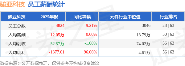 证券之星消息,4月28日骏亚科技公布2025年年报,当年营收25.36亿元,同比增8.04%;净利润为-688.12万元,同比增95.54%。根据财报数据披露,当年公司员工总数4824人,同比增9.21%;人均薪酬12.05万元,同比增0.6%;人均创收52.57万元,同比减1.08%;公司员工薪酬统计见下表: