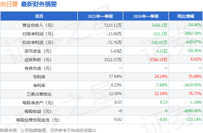据证券之星公开数据整理,近期向日葵(300111)发布2026年一季报。截至本报告期末,公司营业总收入5456.2万元,同比下降24.46%,归母净利润-521.5万元,同比下降3882.5%。按单季度数据看,第一季度营业总收入5456.2万元,同比下降24.46%,第一季度归母净利润-521.5万元,同比下降3882.5%。本报告期向日葵三费占比上升明显,财务费用、销售费用和管理费用总和占总营收同比增幅达76.75%。