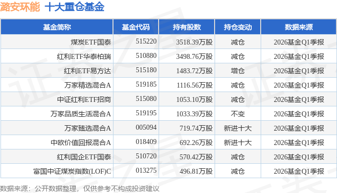 持有潞安环能最多的基金为煤炭ETF国泰,目前规模为101.13亿元,最新净值1.2532(4月27日),较上一交易日上涨0.55%,近一年上涨31.31%。该基金现任基金经理为吴中昊。