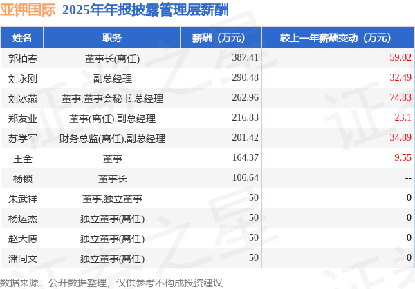 证券之星消息,亚钾国际发布2025年年报,数据显示:公司主营收入53.25亿元,同比增50.09%。归母净利润为16.73亿元,同比增75.97%。扣非净利润为18.56亿元,同比增108.11%。当年公司员工总数7171人,同比增23.47%。人均薪酬12.32万元(注:"人均薪酬"根据定期报告中"应付职工薪酬"附注的本期增加值 / 员工总数计算而来),同比减15.62%。人均创收74.26万元,同比增21.56%。人均创利23.27万元,同比增47.83%。其中管理层薪酬总额为1830.11万元,同比上一年减3.16%,薪酬最高的为董事长(离任)郭柏春,薪酬387.41万元。