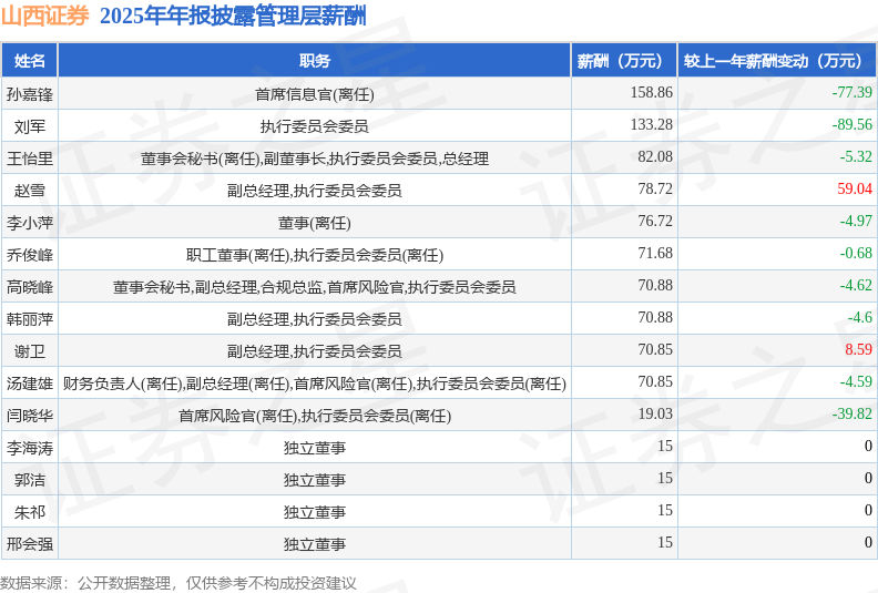 证券之星消息,山西证券发布2025年年报,数据显示:公司主营收入33.51亿元,同比增11.8%。归母净利润为9.24亿元,同比增29.86%。扣非净利润为8.85亿元,同比增26.19%。当年公司员工总数2913人,同比减2.05%。人均薪酬46.46万元(注:"人均薪酬"根据定期报告中"应付职工薪酬"附注的本期增加值 / 员工总数计算而来),同比增4.05%。人均创收115.03万元,同比增8.53%。人均创利30.52万元,同比增31.4%。其中管理层薪酬总额为963.83万元,同比上一年减37.51%,薪酬最高的为首席信息官(离任)孙嘉锋,薪酬158.86万元。