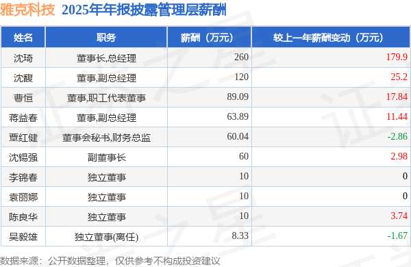 证券之星消息,雅克科技发布2025年年报,数据显示:公司主营收入86.11亿元,同比增25.49%。归母净利润为10.0亿元,同比增14.77%。扣非净利润为9.54亿元,同比增5.91%。当年公司员工总数3100人,同比增5.44%。人均薪酬25.94万元(注:"人均薪酬"根据定期报告中"应付职工薪酬"附注的本期增加值 / 员工总数计算而来),同比增8.61%。人均创收277.79万元,同比增19.01%。人均创利33.21万元,同比增16.01%。其中管理层薪酬总额为691.35万元,同比上一年增27.29%,薪酬最高的为董事长,总经理沈琦,薪酬260.0万元。