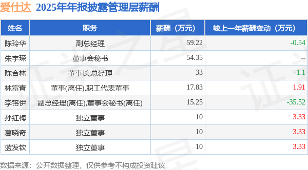 证券之星消息,爱仕达发布2025年年报,数据显示:公司主营收入26.76亿元,同比减8.52%。归母净利润为-2.17亿元,同比减1539.65%。扣非净利润为-2.39亿元,同比减587.27%。当年公司员工总数3746人,同比减1.27%。人均薪酬16.29万元(注:"人均薪酬"根据定期报告中"应付职工薪酬"附注的本期增加值 / 员工总数计算而来),同比增4.71%。人均创收71.45万元,同比减7.35%。其中管理层薪酬总额为209.65万元,同比上一年减31.59%,薪酬最高的为副总经理陈玲华,薪酬59.22万元。