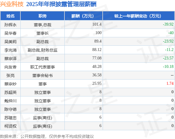 证券之星消息,兴业科技发布2025年年报,数据显示:公司主营收入29.86亿元,同比增1.19%。归母净利润为1.01亿元,同比减28.41%。扣非净利润为9354.62万元,同比减30.07%。当年公司员工总数3972人,同比增7.93%。人均薪酬11.16万元(注:"人均薪酬"根据定期报告中"应付职工薪酬"附注的本期增加值 / 员工总数计算而来),同比增1.18%。人均创收75.18万元,同比减6.25%。人均创利4.5万元,同比减19.95%。其中管理层薪酬总额为602.81万元,同比上一年减15.49%,薪酬最高的为董事,总裁孙辉永,薪酬101.4万元。