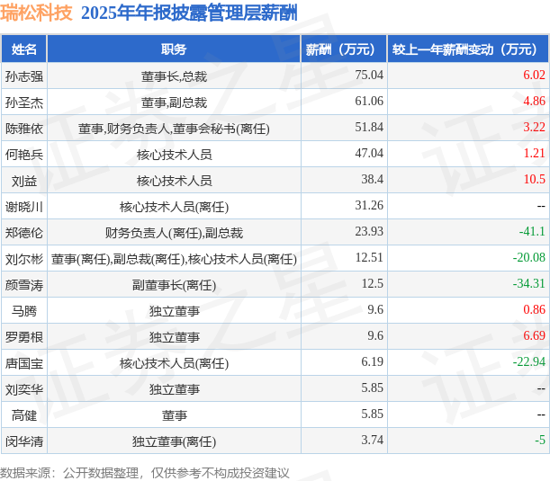 证券之星消息,瑞松科技发布2025年年报,数据显示:公司主营收入9.45亿元,同比增6.55%。归母净利润为1154.75万元,同比增2.66%。扣非净利润为775.77万元,同比增273.68%。当年公司员工总数887人,同比增7.52%。人均薪酬19.32万元(注:"人均薪酬"根据定期报告中"应付职工薪酬"附注的本期增加值 / 员工总数计算而来),同比增5.14%。人均创收106.53万元,同比减0.89%。人均创利1.53万元,同比减14.6%。其中管理层薪酬总额为394.41万元,同比上一年减23.28%,薪酬最高的为董事长,总裁孙志强,薪酬75.04万元。