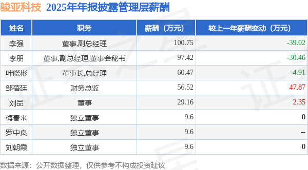 证券之星消息,骏亚科技发布2025年年报,数据显示:公司主营收入25.36亿元,同比增8.04%。归母净利润为-688.12万元,同比增95.54%。扣非净利润为-2791.23万元,同比增82.68%。当年公司员工总数4824人,同比增9.21%。人均薪酬12.05万元(注:"人均薪酬"根据定期报告中"应付职工薪酬"附注的本期增加值 / 员工总数计算而来),同比增0.6%。人均创收52.57万元,同比减1.08%。其中管理层薪酬总额为373.12万元,同比上一年减26.99%,薪酬最高的为董事,副总经理李强,薪酬100.75万元。