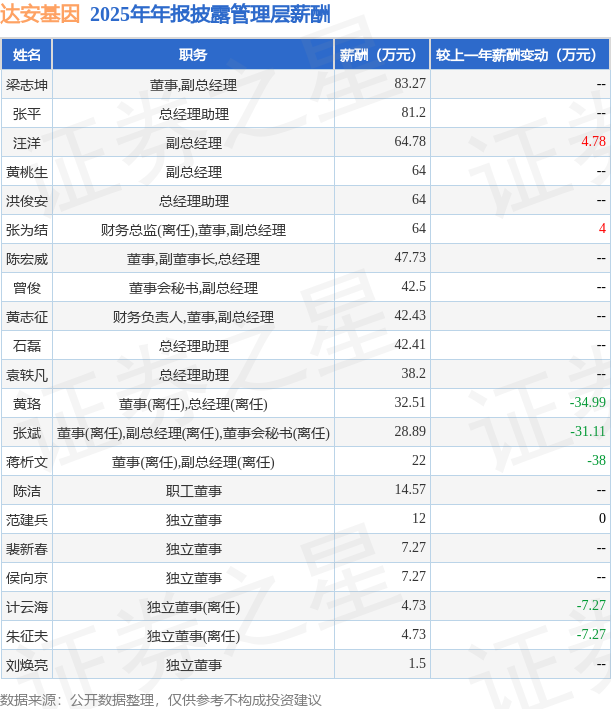 证券之星消息,达安基因发布2025年年报,数据显示:公司主营收入7.58亿元,同比减11.18%。归母净利润为-7.44亿元,同比增19.54%。扣非净利润为-7.72亿元,同比增6.15%。当年公司员工总数1506人,同比减12.95%。人均薪酬23.81万元(注:"人均薪酬"根据定期报告中"应付职工薪酬"附注的本期增加值 / 员工总数计算而来),同比增28.02%。人均创收50.31万元,同比增2.03%。其中管理层薪酬总额为769.99万元,同比上一年增98.33%,薪酬最高的为董事,副总经理梁志坤,薪酬83.27万元。