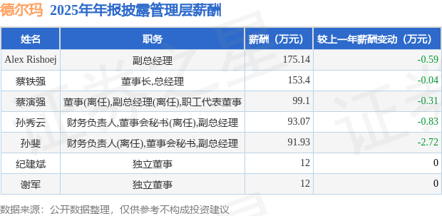 证券之星消息,德尔玛发布2025年年报,数据显示:公司主营收入34.32亿元,同比减2.81%。归母净利润为1.3亿元,同比减8.94%。扣非净利润为7847.74万元,同比减39.77%。当年公司员工总数2697人,同比减7.16%。人均薪酬19.91万元(注:"人均薪酬"根据定期报告中"应付职工薪酬"附注的本期增加值 / 员工总数计算而来),同比增17.99%。人均创收127.24万元,同比增4.68%。人均创利4.84万元,同比增0.42%。其中管理层薪酬总额为636.64万元,同比上一年减11.67%,薪酬最高的为副总经理Alex Rishoej,薪酬175.14万元。