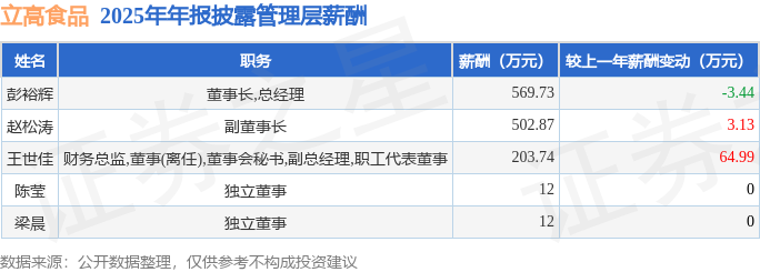 证券之星消息,立高食品发布2025年年报,数据显示:公司主营收入43.54亿元,同比增13.51%。归母净利润为3.05亿元,同比增13.71%。扣非净利润为2.95亿元,同比增16.13%。当年公司员工总数3949人,同比增1.75%。人均薪酬16.8万元(注:"人均薪酬"根据定期报告中"应付职工薪酬"附注的本期增加值 / 员工总数计算而来),同比减3.31%。人均创收110.25万元,同比增11.56%。人均创利7.51万元,同比增10.6%。其中管理层薪酬总额为1300.34万元,同比上一年减21.76%,薪酬最高的为董事长,总经理彭裕辉,薪酬569.73万元。