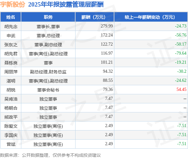 证券之星消息,宇新股份发布2025年年报,数据显示:公司主营收入81.56亿元,同比增5.91%。归母净利润为-3919.26万元,同比减112.76%。扣非净利润为-6347.05万元,同比减122.05%。当年公司员工总数975人,同比增4.95%。人均薪酬23.73万元(注:"人均薪酬"根据定期报告中"应付职工薪酬"附注的本期增加值 / 员工总数计算而来),同比减12.57%。人均创收836.5万元,同比增0.92%。其中管理层薪酬总额为1085.24万元,同比上一年减29.7%,薪酬最高的为董事长,董事胡先念,薪酬279.99万元。