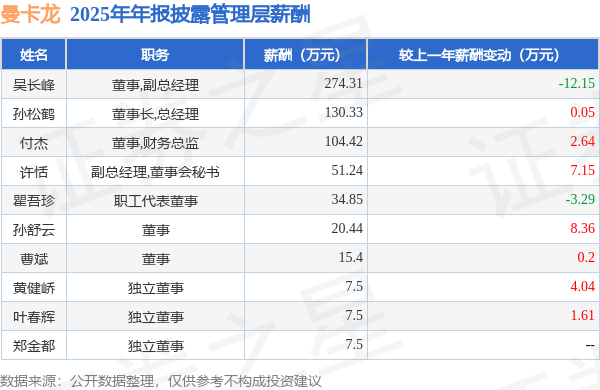 证券之星消息,曼卡龙发布2025年年报,数据显示:公司主营收入27.39亿元,同比增16.19%。归母净利润为1.15亿元,同比增19.19%。扣非净利润为9824.72万元,同比增21.56%。当年公司员工总数862人,同比增16.49%。人均薪酬13.97万元(注:"人均薪酬"根据定期报告中"应付职工薪酬"附注的本期增加值 / 员工总数计算而来),同比减5.12%。人均创收317.73万元,同比减0.26%。人均创利13.39万元,同比增2.28%。其中管理层薪酬总额为653.49万元,同比上一年减5.65%,薪酬最高的为董事,副总经理吴长峰,薪酬274.31万元。