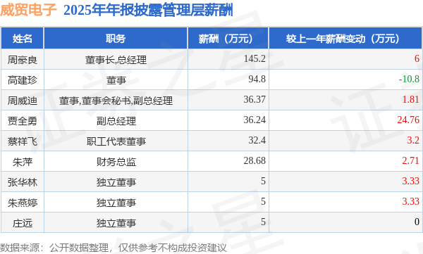 证券之星消息,威贸电子发布2025年年报,数据显示:公司主营收入2.88亿元,同比增10.79%。归母净利润为4846.99万元,同比增8.73%。扣非净利润为4488.24万元,同比增13.55%。当年公司员工总数342人,同比增1.79%。人均薪酬13.33万元(注:"人均薪酬"根据定期报告中"应付职工薪酬"附注的本期增加值 / 员工总数计算而来),同比减2.86%。人均创收84.28万元,同比增8.85%。人均创利14.22万元,同比增6.82%。其中管理层薪酬总额为388.69万元,同比上一年减9.01%,薪酬最高的为董事长,总经理周豪良,薪酬145.2万元。
