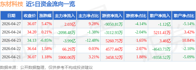 证券之星消息,截至2026年4月27日收盘,东材科技(601208)报收于36.07元,上涨5.47%,换手率6.06%,成交量61.19万手,成交额21.87亿元。